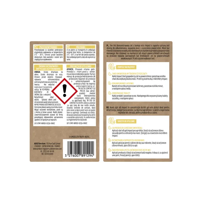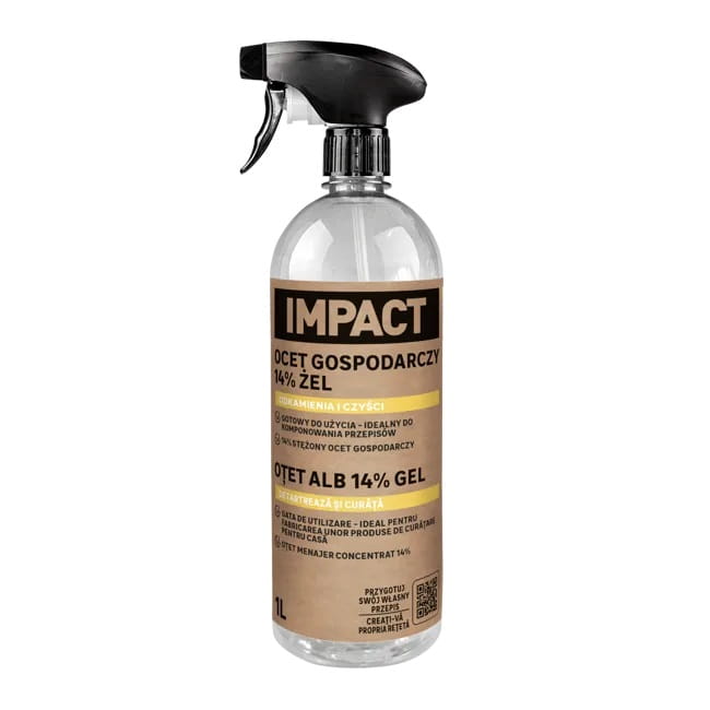 Ocet biały Impact Gel skoncentrowany w stężeniu 14° jest idealnym sojusznikiem do usuwania kamienia, plam i czyszczenia powierzchni. Jego żelowa konsystencja sprawia, że idealnie nadaje się do powierzchni pionowych i kranów. Stężenie 14° octu białego Impact gwarantuje większą skuteczność niż klasyczny ocet biały 9,5°. Bardziej intensywna kwasowość pozwala na odkamienianie o 40% skuteczniejsze niż ocet o niższym stężeniu
