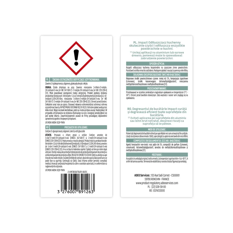 Ultramocny odtłuszczacz kuchenny Impact dokładnie czyści i odtyka wszystkie powierzchnie w Twojej kuchni. Rozpuszcza nawet smażone tłuszcze. Idealny do piekarników, płyt grzewczych, grilli itp. Pozostawia przyjemny cytrusowy zapach. Nadaje się do kontaktu z żywnością po dokładnym spłukaniu. Unikaj stosowania na powierzchniach aluminiowych lub nieobrobionych powierzchniach z surowego drewna, ponieważ może to spowodować plamy na powierzchni.