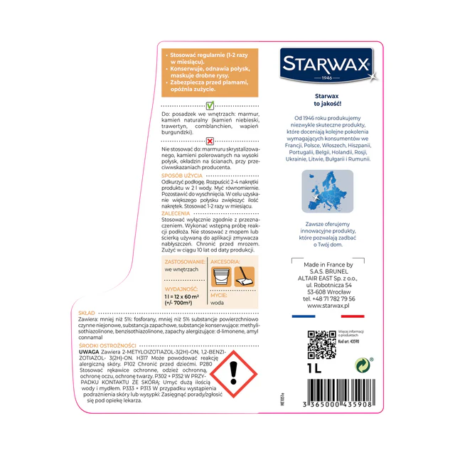 Starwax Balsam nabłyszczający to specjalistyczny skoncentrowany preparat na bazie żywic polimerowych przeznaczony do pielęgnacji i nabłyszczania posadzek marmurowych i kamiennych we wnętrzach, a także renowacji zmatowiałych z czasem posadzek. Stosowany bez rozcieńczania tworzy twardą i silnie nabłyszczającą warstwę ochronną. Stosowany w roztworze wodnym raz na 2 tygodnie myje, pielęgnuje i nabłyszcza. Nie tworzy śliskiej warstwy. Wydajność: ok. 400 m2/ 1l. Sprzęt: ścierka lub mop z mikrofibry, wiaderko.