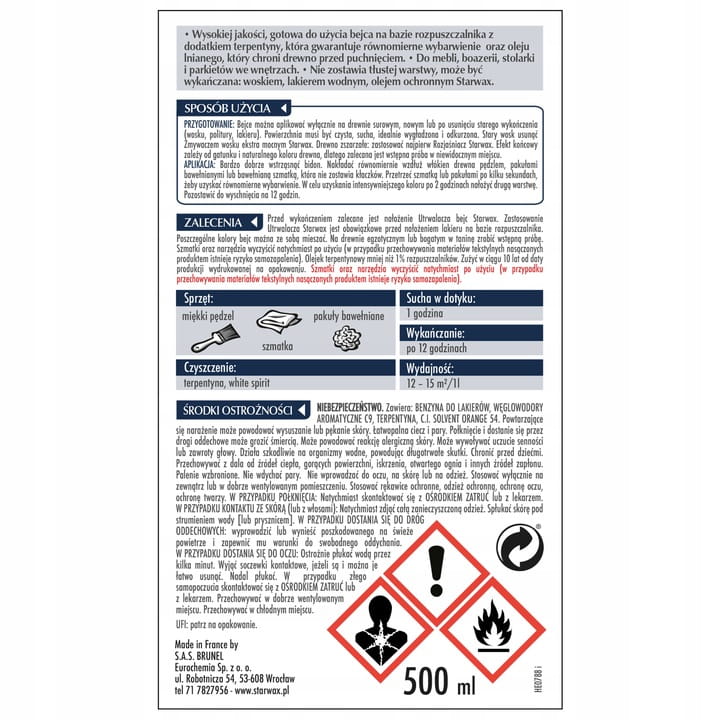 Sposób użycia: Dobrze wstrząsnąć opakowanie. Stosować na drewno suche, czyste, idealnie wyszlifowane, dokładnie odkurzone.Nanosić pędzlem lub pakułami bawełnianymi wzdłuż włókien drewna. Przetrzeć pakułami, żeby usunąć nadmiar z powierzchni. Pozostawić do wyschnięcia na co najmniej 8 godzin. W celu uzyskania intensywniejszego koloru nałożyć drugą warstwę po wyschnięciu pierwszej.