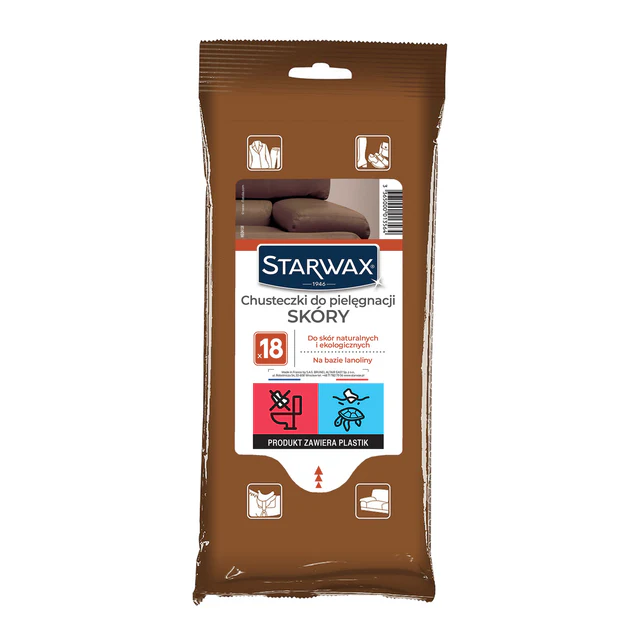 Starwax Chusteczki do czyszczenia i pielęgnacji - usuwają zabrudzenia, odżywiają, działają ochronnie. Zawierają lanolinę. Do obić meblowych (nawet porowatych), odzieży, galanterii, obuwia. Duży format. Przyjemny zapach.