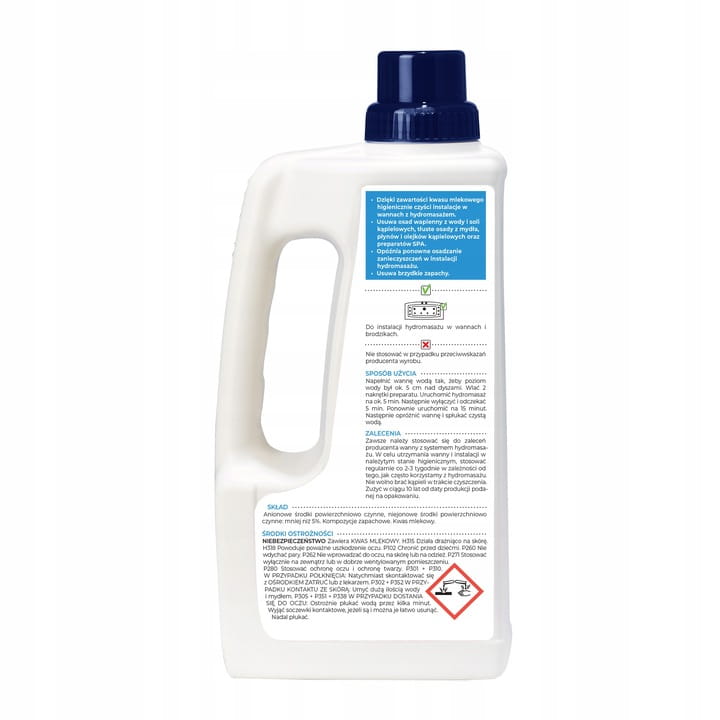 To środek do instalacji hydromasażu w wannach i brodzikach. Higienicznie czyści i odwapnia. Usuwa brzydkie zapachy. Dzięki zawartości kwasu mlekowego higienicznie czyści instalacje w wannach z hydromasażem. Usuwa osad wapienny z wody i soli kąpielowych, tłuste osady z mydła, płynów i olejków kąpielowych oraz preparatów SPA. Opóźnia ponowne osadzanie zanieczyszczeń w instalacji hydromasażu.