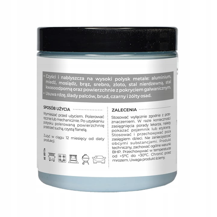 Pasta polerska czyszczenie i nabłyszczanie usuwa rdzę, sczernienia, zżółknięcia, ślady palców, brud. Czyści i nabłyszcza na wysoki połysk. Produkt gotowy do użycia. Do polerowania ręcznego lub mechanicznego. Nie stosować na powierzchniach lakierowanych.