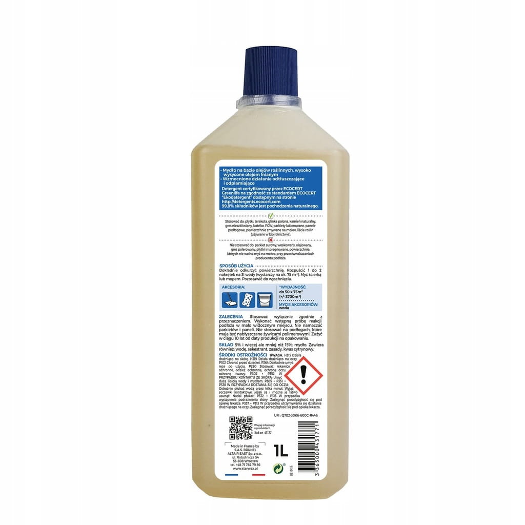 SPOSÓB UŻYCIA: Odkurzyć powierzchnię. Rozpuścić 1 nakrętkę Mydła w 5 litrach zimnej lub letniej wody. Umyć mopem lub ścierką owiniętą wokół szczotki na drążku. Pozostawić do wyschnięcia.