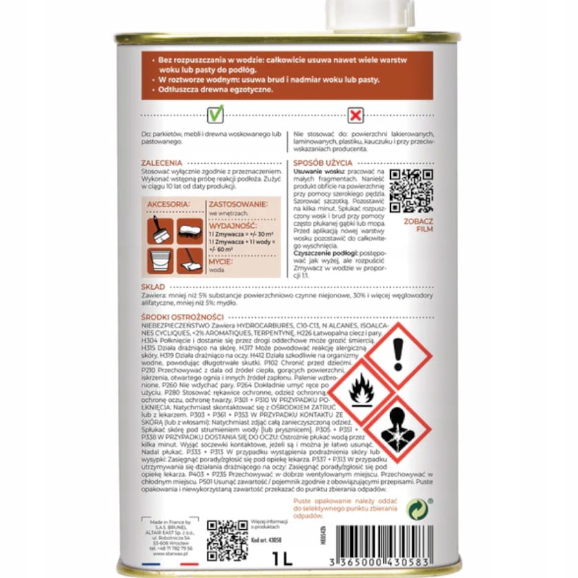 - Całkowite usunięcie wosku: Stosować produkt bez rozcieńczania. Nanieść na powierzchnię pędzlem. Trzeć szczotką lub wełną stalową 2. Zostawić na powierzchni przez kilka minut. Usunąć wilgotną gąbką lub szmatką. Spłukać powierzchnię często płukaną wilgotną gąbką lub szmatką.